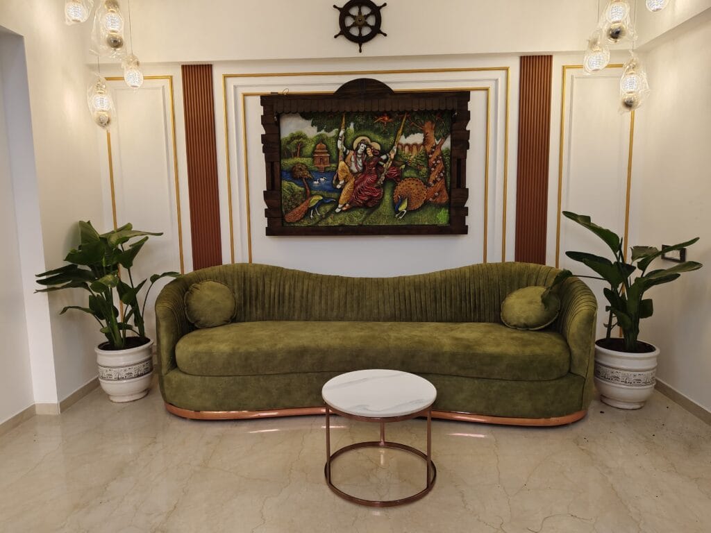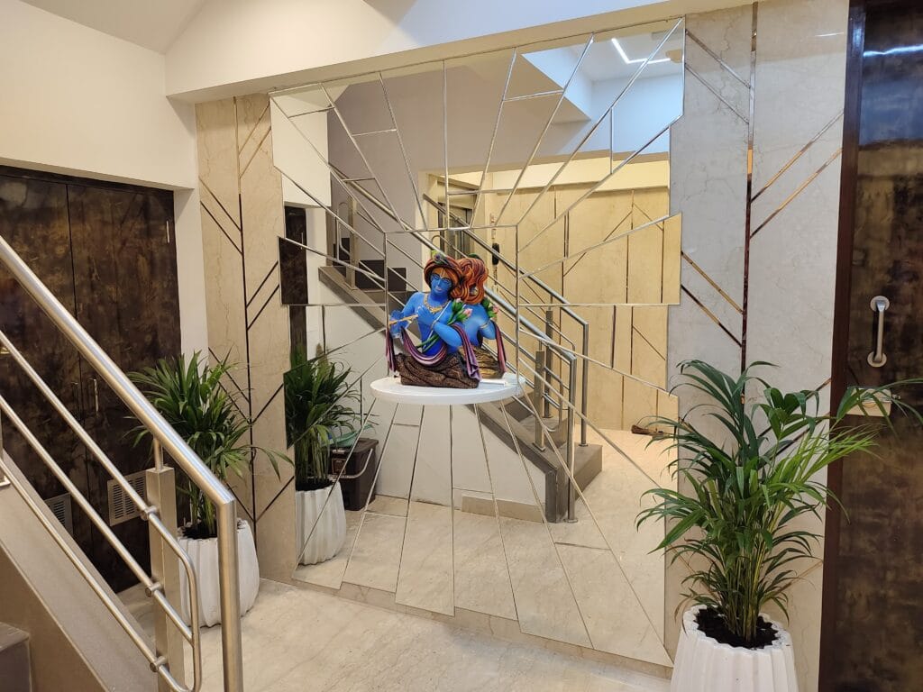 Each space is thoughtfully planned – from the vibrant living area and serene bedrooms to the decorative foyer with mirror installations and sculptures. The home reflects a perfect balance of luxury, comfort, and aesthetic detailing throughout.